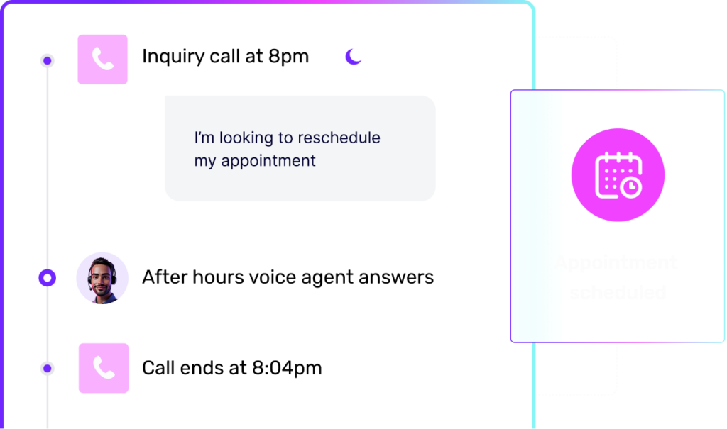 After Hours handoffWhen the queue closes, your agent takes over. Same number, same experience, 24/7 coverage.